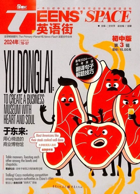 ——《英語街初中版》是一本以初中生的視角來閱讀世界的雙語雜志,專門為中國7~9年級學生量身打造。雜志的內容豐富多彩,圖文并茂、48頁16開全彩精美印刷,包括全球初中生的生存狀態、學習、娛樂、交往經歷等。書中的內容集知識性、趣味性和互動性為一體。部分欄目更是由全國雙語教材中心的專家和英美外籍教師親自擔綱并精心打造。它是最新最流行的時尚文化集結地,最好玩最可樂的信息匯集地,最感人最轟動的美文大本營,最全面最實用的考試技巧點撥所,也是最貼近中考最輕松的英語閱讀學習資料。